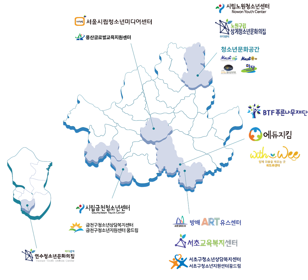 | Geumcheon-Gu Youth Consultation Welfare Center | 2F, 88, Seocho-daero 46-gil, Seocho-gu, Seoul, Republic of Korea | 02-803-1873 | Homepage | Map |